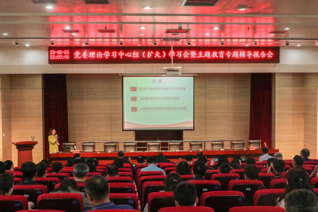 5月15日下午,学校组织召开党委理论学习中心组(扩大)学习会暨主题教育专题辅导报告会。校党政领导、副处级以上干部参加学习。