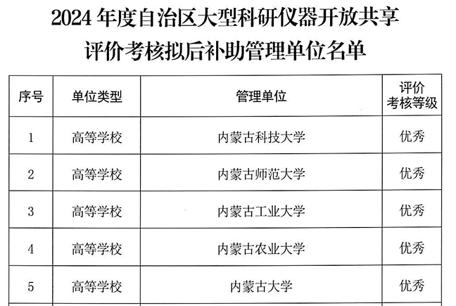 5月6日,自治区科技厅发布了《关于公示2024年度自治区大型科研仪器开放共享评价考核拟后补助名单的通知》,永利官网获评考核“优秀”单位。
