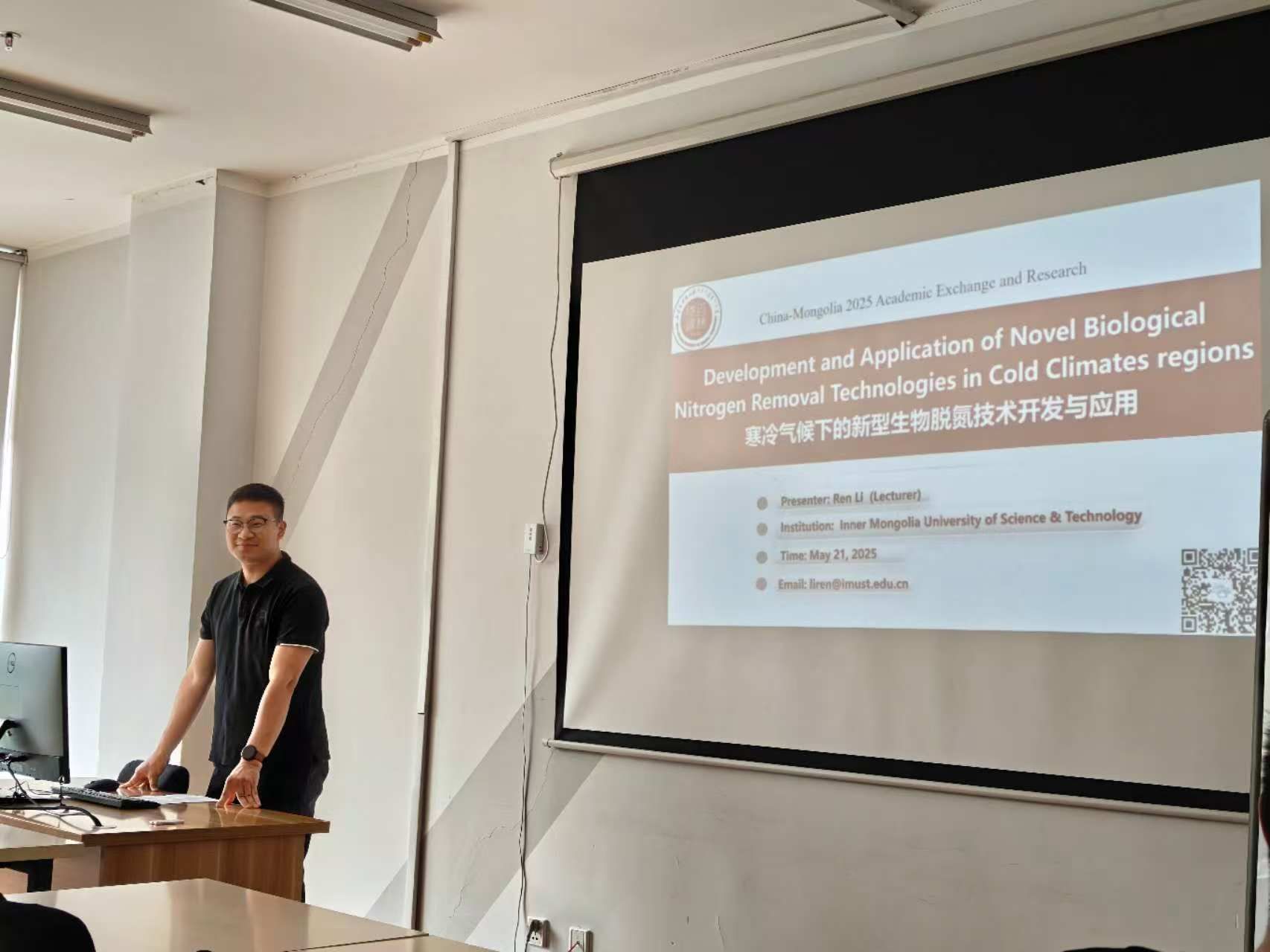 蒙古国立大学工程技术研究院院长Sonomdagva接待了团队人员,详细介绍了工程技术研究院环境科学与工程专业的建设历程与研究方向。李韧老师和硕士研究生张宝平分别向蒙古国立大学师生作题为《R&D and application of novel low-temperature nitrogen removal technologies》《Advances in wastewater treatment: low-temperature adaptation, carrier development, antibiotic response, reactors》的报告,系统展示了永利官网黄河流域寒旱区水土环境研究中心的研究方向和进展。双方就中蒙污水处理技术的差异性和所面临的不同挑战进行深入交流。