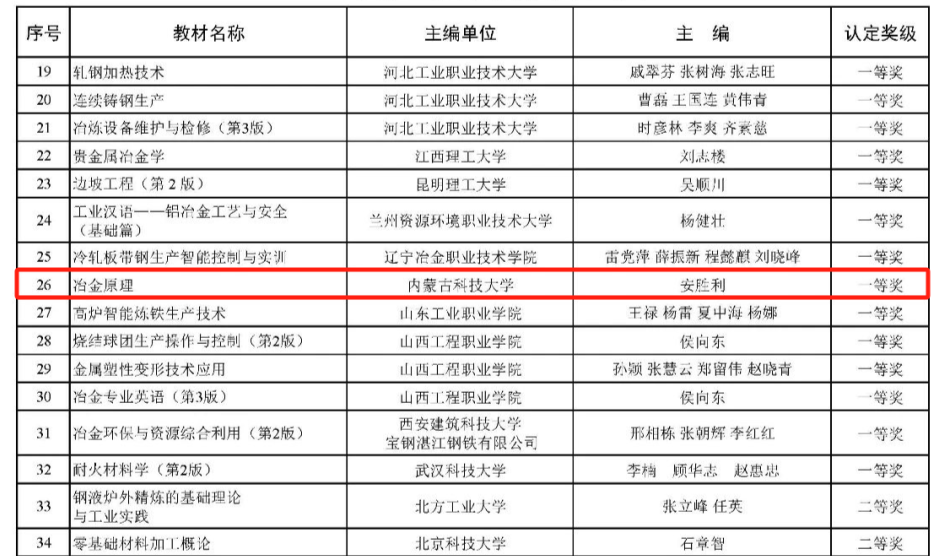 日前,中国冶金教育协会“关于公布2025年冶金类优秀教材认定结果的通知”中,yL23411永利的《冶金原理》《金属热处理原理及工艺》《智能井巷工程》《矿井通风安全测试理论与技术》《控制与电气类专业毕业设计(论文)指导及案例》《大学物理(力学、相对论、振动波动、热学)(上)》《大学物理(电磁学、光学、量子物理)(下)》《智能逻辑控制器应用教程--基于西门子LOGO!》《安全工程数值计算方法与软件》《Flink实时大数据处理技术》等9种教材入选。