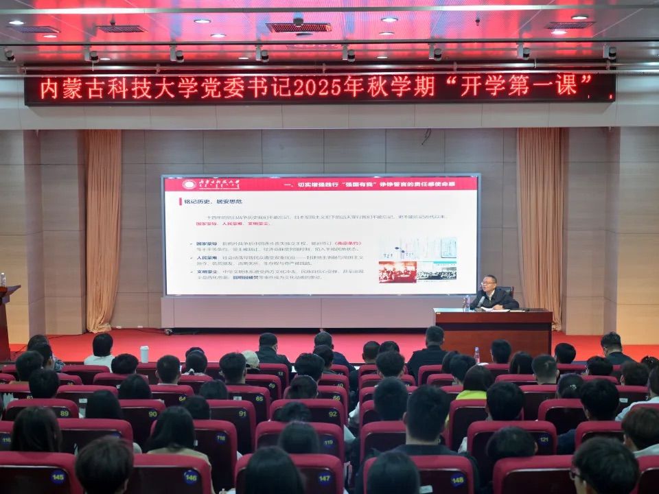 10月10日下午,校党委书记呼和以《锚定时代坐标 勇担强国重任 努力成为新时代合格的建设者》为题讲授“开学第一课”。组织部、宣传部、学生工作部、团委负责人,各学院党委书记、带队教导员,2025级本科生、研究生代表等270余人参会学习。