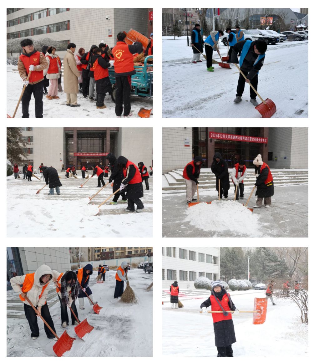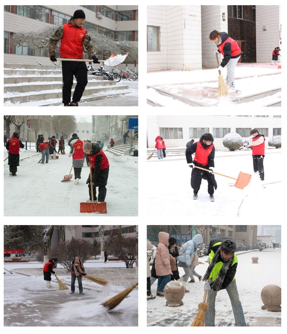 身着红色志愿马甲的青年志愿者们手持铁锹、扫帚等工具,迅速奔赴各责任区域。从校门主干道到宿舍楼下,从图书馆台阶到食堂入口,志愿者们分工明确、默契协作。凛冽寒风中,他们的脸颊被冻得通红,呼出的白雾与飞扬的雪沫交织,但每个人眼中都闪烁着热忱的光芒,劳动的号子与工具碰撞的声响打破了冬日的静谧,汇成一曲温暖的青春赞歌。