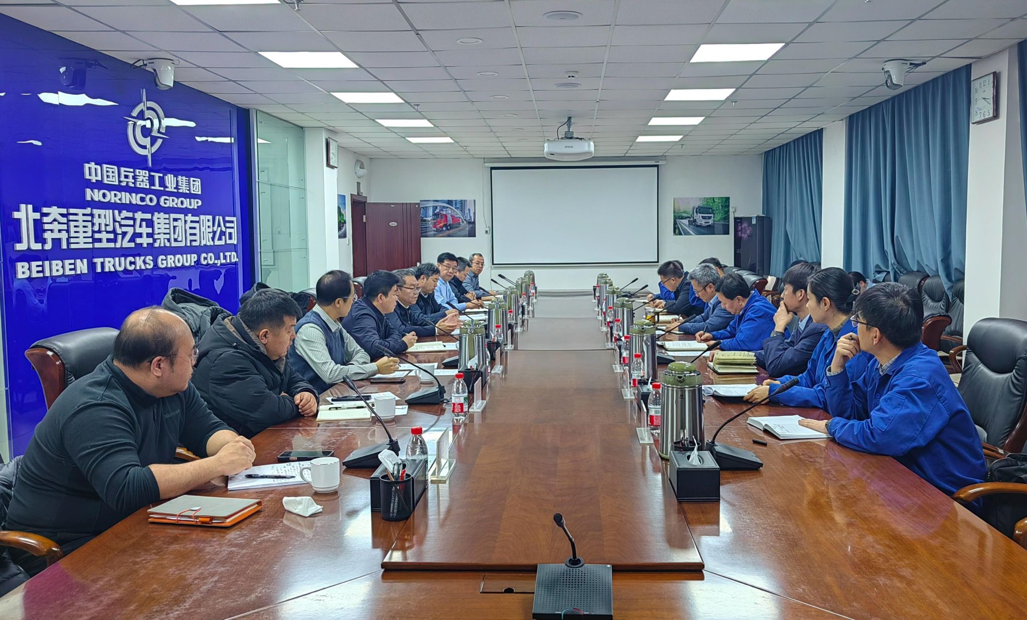 在北奔重型汽车集团有限公司,党委书记、董事长牟月辉,党委副书记、纪委书记、工会主席王志亮,副总经理庞建中等领导会见呼和、韩永全一行并座谈交流。