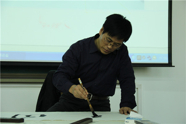乔雁老师以《对于书法的再认识》为题,分别从书法的含义、书写方法、艺术的文字、黑白世界的阴阳哲学、书法的欣赏标准、古代书法名家作品及经典作品赏析等方面做了详细的讲述。他通过理论讲解、现场即兴书写及师生互动让永利官网师生领略到书法的真正内涵和魅力。最后,校团委负责人代表学校特聘请乔雁老师为永利官网客座教授并为其颁发了聘书。