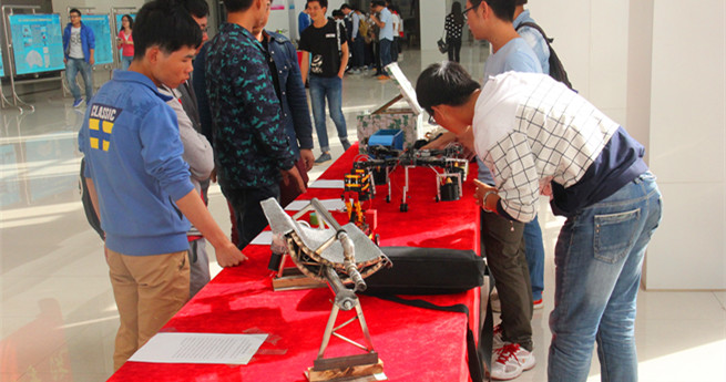 本次科技创新成果展参展作品包括在RoboMasters2015全国大学生机器人大赛获全国三等奖作品机器人、跳舞机器人、擂台机器人等各类电子信息科技作品;光伏光热发电积水装置、四轴飞行器、汽车尾气温差发电装置等各类机械科技作品;桥梁模型、吊脚楼模型、承重桥等各类土木建筑科技作品。参展作品受到学生们的一致好评,也为众多科技创新爱好者提供了创新的源泉。
