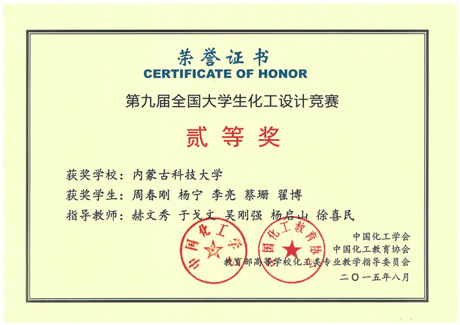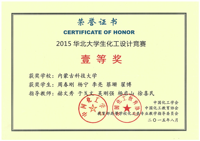 11月9日,化工学院收到由中国化工学会寄来的获奖证书,由永利官网化工学院学生组成的“鹿坪”代表队,在2015年第九届“东华科技-三井化学杯”全国大学生化工设计竞赛华北地区预选赛中荣获全国二等奖和华北赛区一等奖。