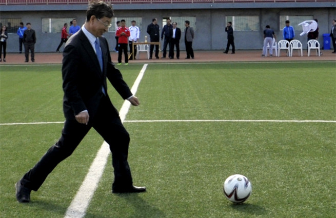 接下来,校长及各学院负责人参加赠球仪式,由安胜利转交流动奖杯。