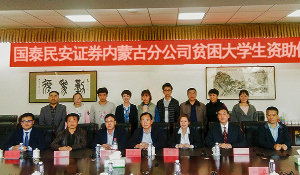 11月1日,国泰君安证券内蒙古分公司到经济与管理学院开展捐资助学活动,捐助仪式在行政楼A205举行。校党委常委、副校长李国雄,捐助方总经理周瑞,经济与管理学院相关负责人、班主任代表、资助与就业工作负责人及受助学生参加仪式。本次共捐助4名贫困学子,捐助额每人每学年5000元。