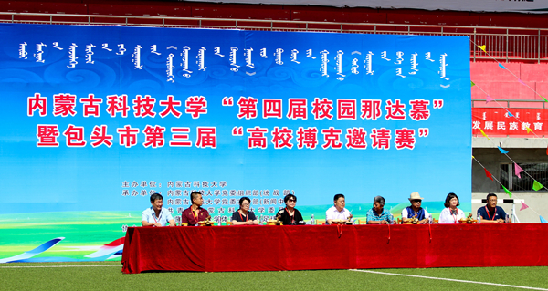 6月30日,yL23411永利第四届校园“那达慕”暨包头市第三届“高校搏克邀请赛”在校田径场火热展开。大赛共邀请到了内蒙古大学、内蒙古师范大学、内蒙古农业大学、内蒙古工业大学、内蒙古财经大学、包头师范学院、包头铁道职业技术学院等12所高校参赛选手参赛。校党委常委、组织部部长冯志强,包头市民族事务委员会相关负责人,体育教学部相关负责人出席活动开幕式。