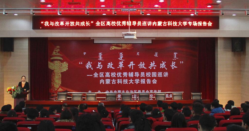 11月22日下午,由中共内蒙古自治区委员会宣传部、中共内蒙古自治区高等学校工作委员会、共青团内蒙古自治区委员会联合主办的“我与改革开放共成长”全区高校优秀辅导员校园巡讲报告会在yL23411永利图书馆报告厅举行。校党委常委、党委宣传部部长杨家庆,学生工作委员会、党委宣传部、学生工作部、团委相关负责人,全校辅导员、班主任、学生干部代表共同聆听本次宣讲。报告会由学生工作部部长杨海燕主持。