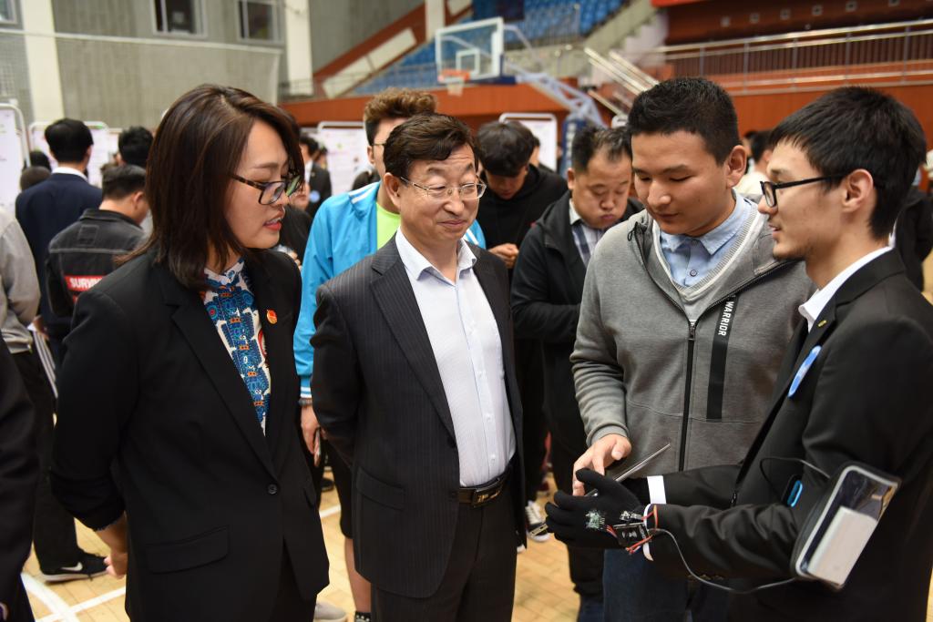 安胜利宣布决赛比赛正式开始,并在参观作品期间与参赛者交流、探讨。他对参赛者的创新精神给予充分肯定,鼓励大家将作品进一步应用于实践,并对参赛作品提出意见和建议。安胜利在参观期间指出,学校的“挑战杯”举办至今发掘到了很多优秀人才和独具特色的作品,有效促进了学生的知识应用、有效培养了学生的动手能力,希望通过“挑战杯”培养科大学子的创新意识和实践能力。
