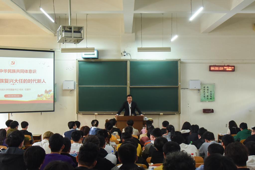 3月11日下午,校党委副书记、校长任慧平以《铸牢中华民族共同体意识做担当民族复兴大任的时代新人》为题,为信息工程学院大一学子讲授了生动的开学第一课。任慧平围绕铸牢中华民族共同体意识的主要内涵、重要意义以及中国梦的实现与铸牢中华民族共同体意识的紧密联系等内容进行了深入浅出的讲授,并寄语广大学子要做担当民族复兴大任的时代新人,要树立远大理想、厚植爱国情怀、培养良好品质、砥砺奋斗精神、增长知识才干、提高综合素质。课间,任慧平走到学生中间进行了亲切交流,他叮嘱同学们要抓住大学一年级的关键期,做好从中等教育到高等教育的转换,要有理想、有信念,志存高远;要努力学习、多读书,做一名合格的社会主义接班人。