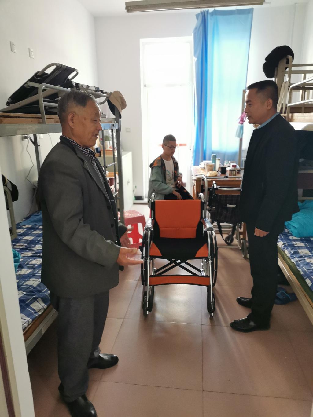 后勤处相关负责人在实地走访中了解到一名2021级学子身体残疾,上下课需爷爷用轮椅接送,出行非常困难。在住宿床位紧张的情况下,后勤处积极采取措施在19#公寓楼腾出一间宿舍,专供这名学生和爷爷居住,进一步完善无障碍通道方便该生出行,并向这位学生捐赠了一台轮椅。
