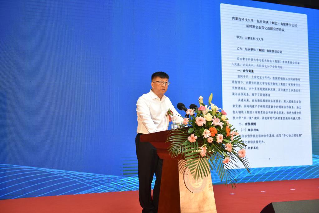 成涛在致辞中表示,包钢是科技大学发展建设史上的好伙伴、好朋友,校企共同缔结了深厚友谊。“齐心协力建包钢”的历史佳话为双方立足新时代、面向新征程全面深入战略合作,奠定了坚实的历史基础、发展基础和行动基础。双方将紧紧围绕国家战略、自治区布局、地方经济需要和各自特点,聚焦人才培养、科学研究、社会服务、产学研用转化、平台建设以及学校“双一流”建设,共同解决好校企深度合作、深度融合发展的课题,将彼此优势转化为新的发展增长点,着力打造新时期校企合作新典范。